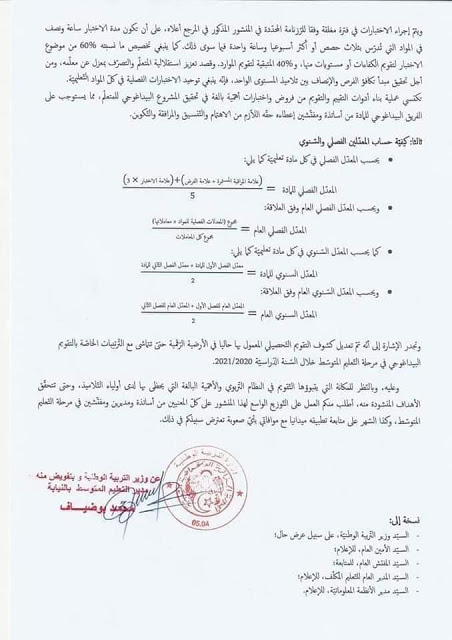 وجهت وزارة التربية الوطنية، مراسلات خاصة إلى مفتشي التربية ومديري المؤسسات التعليمية للأطوار الثلاث توضح فيها كيفية احتساب المعدلات الفصلية و السنوية وتقويم التلاميذ في كل طور التعليم المتوسط للموسم الدراسي الجديد.